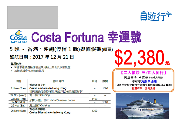 今個聖誕節,小旅人帶同小旅爸、小旅媽坐郵輪「歌詩達幸運號-香港、沖繩-郵輪假期」